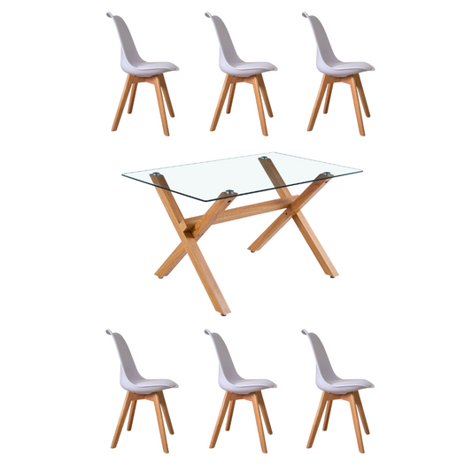 Comedor Mesa Vidrio Cross 140x90 + 6 Sillas Tulip Acolchadas