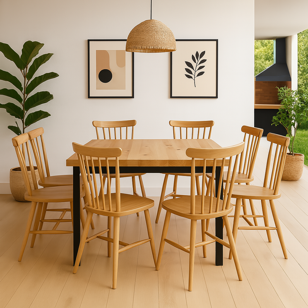 Comedor Industrial Madera Natural 120x120 + 8 Sillas Windsor Madera