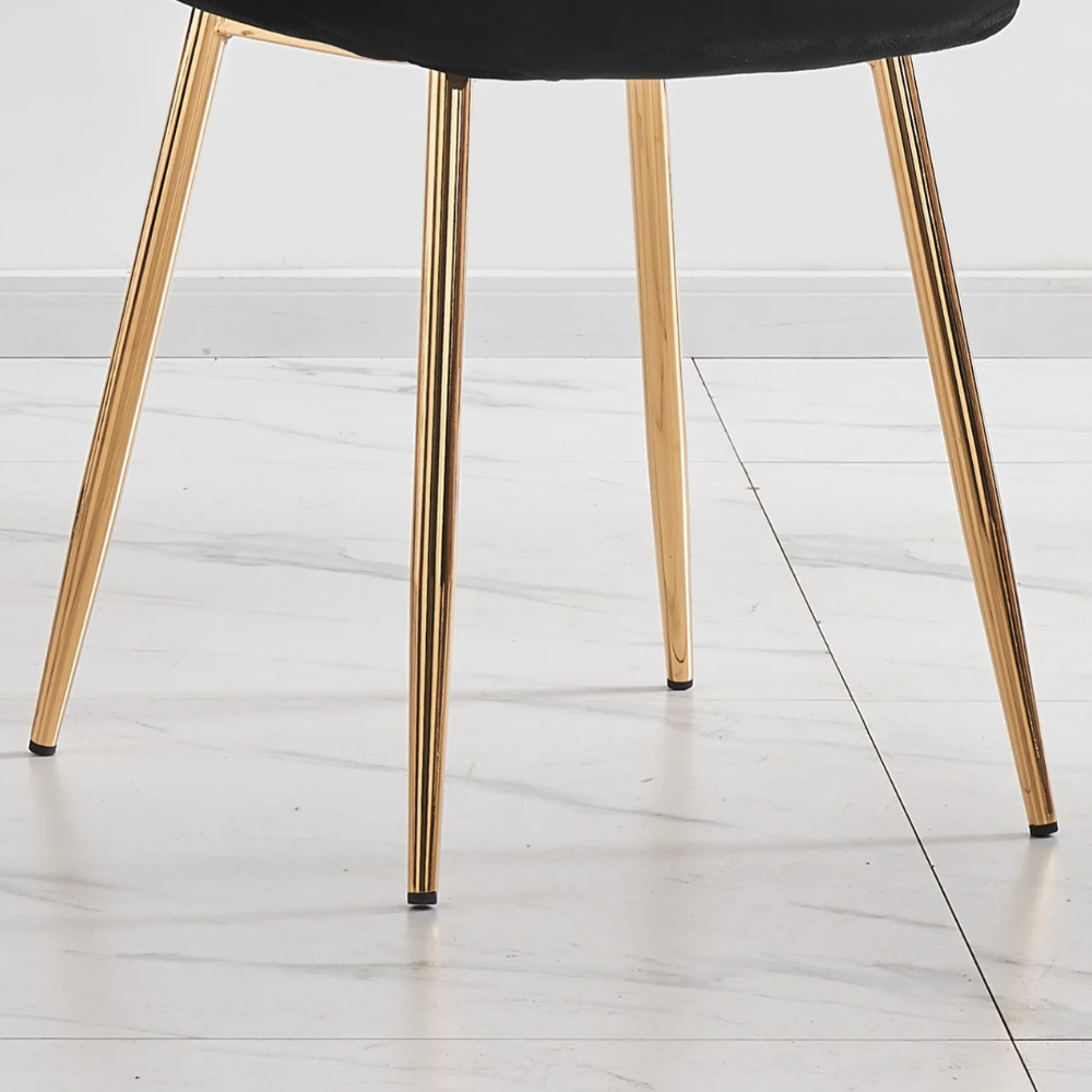 Material Sillas: Asiento totalmente acolchado y tapizado en suave terciopelo con patas de metal color dorado. Material Mesa: Cubierta de vidrio templado con base de metal color dorado. |