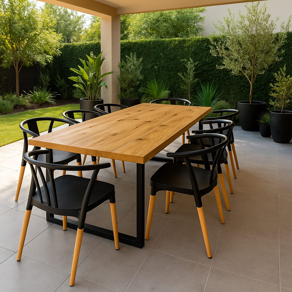 Comedor Terraza Industrial Madera Natural 240x90 + 8 Sillas Wishbone Polipropileno