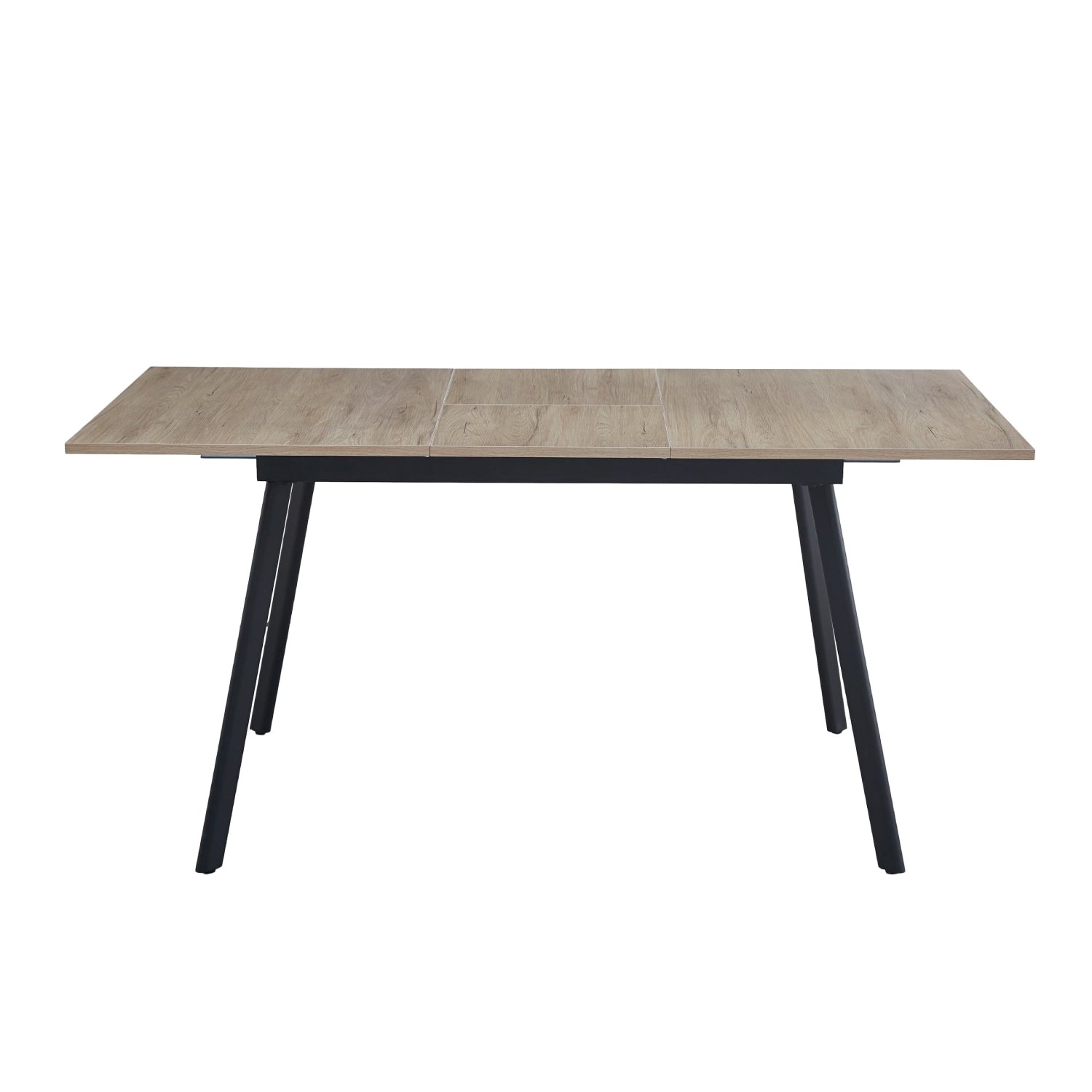 Mesa extensible con cubierta diseño madera clara y base metálica color negro. Se adapta de 120 a 160 cm de largo para mayor comodidad. Ideal para espacios versátiles y reuniones familiares. Apta desde 4 y hasta 6 sillas.