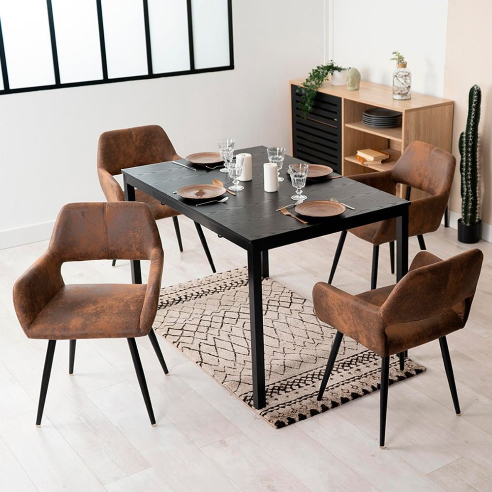 De estilo industrial con tapiz tipo cuero envejecido en tono café y estructura de patas metálicas negras. Su diseño ergonómico con apoyabrazos ofrece comodidad y estilo, ideal para comedores modernos, salas de estar o espacios tipo loft. Una silla versátil que combina funcionalidad y estética vintage para realzar cualquier ambiente.
