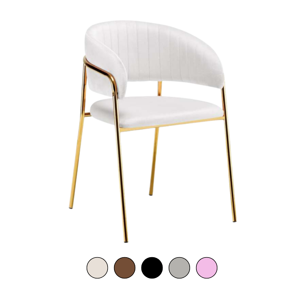 Un clásico sitial diseño velvet. Aquí tenemos esta combinación única que une el color dorado con la suavidad del terciopelo. Es una silla totalmente acolchada, la cual se destaca por su suave tapiz y base de metal dorado.