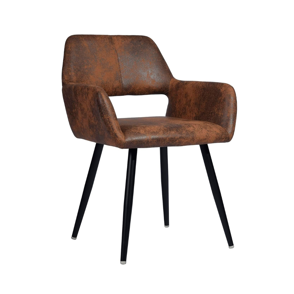 De estilo industrial con tapiz tipo cuero envejecido en tono café y estructura de patas metálicas negras. Su diseño ergonómico con apoyabrazos ofrece comodidad y estilo, ideal para comedores modernos, salas de estar o espacios tipo loft. Una silla versátil que combina funcionalidad y estética vintage para realzar cualquier ambiente.